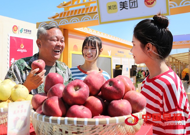 在河南省开封市兰考县仪封镇代庄村的第七个中国农民丰收节主场农产品展销会上,村民在分享丰收的喜悦。