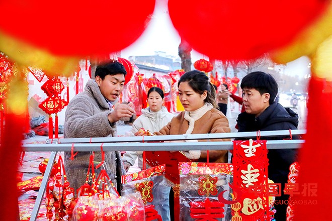 中国早报 河南讯(特约记者 李新义)1月20日,在河南省开封市尉氏县滨河路年货市场,居民们在精心选购新春节庆饰品。