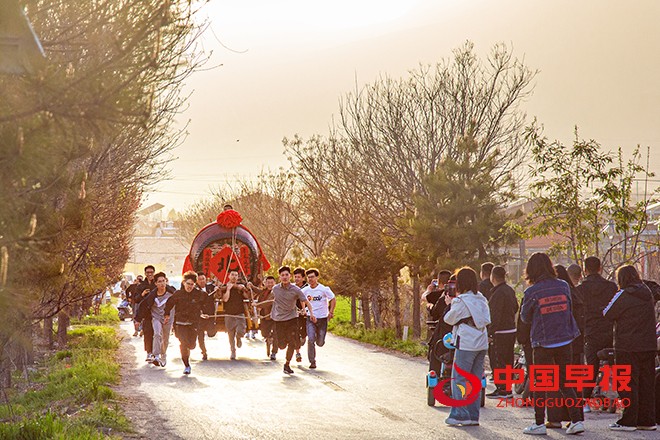 赛场上,村民们争先恐后拉着“南北”两台鼓车,沿着村内外的循环大道激烈追逐、激情竞技。吸引了十里八村的民众前来观看助战,以近距离领略传统民俗文化的独特魅力。跑鼓车习俗起源于春秋时期,由操练军用战鼓发展而来,历经2700多年岁月,已演变成当地别具特色的民间体育赛事,在传承中持续散发活力。
