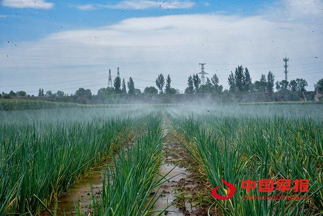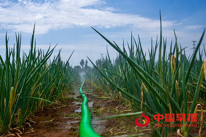 中国早报 山西讯(记者 赵玉虎 特约记者 田红萍)8月14 日,霍州市辛置镇段庄村的200亩大葱种植基地里,骄阳炙烤着大地,却见清泉顺着输水管道奔流而出,化作细密水雾精准洒向葱苗 —— 一场与旱情赛跑的灌溉行动正在这里火热进行。