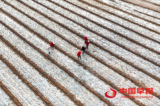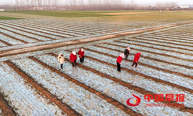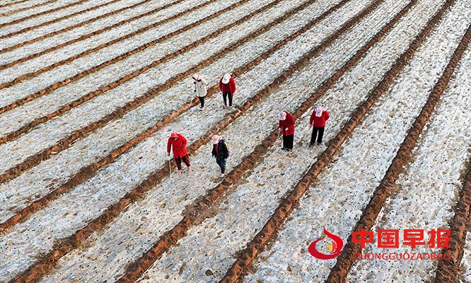 中国早报 河南讯(特约记者 李新义)12月4日,尉氏县多个乡村的大蒜田里一派繁忙景象,农户们抢抓晴好天气,忙着为蒜苗破膜助长,确保幼苗健壮生长。