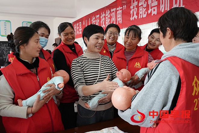 中国早报 河南讯(记者 赵玉虎 特约记者 李新义)2月23日,在河南省开封市尉氏县总工会再就业技能培训班上,培训老师通过模拟示范为学员讲解婴幼儿护理知识。