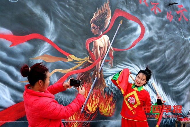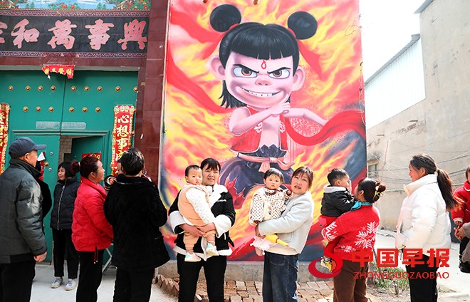 中国早报 河南讯(记者 赵玉虎 特约记者 李新义)3月10日,河南省尉氏县朱曲镇西街村,村民们三五成群,聚集在一幅幅哪吒主题的墙画前,兴奋地拍照、打卡。镜头里,老人们脸上绽放着新奇与喜悦,孩童们摆出各种俏皮姿势,和威风凛凛的哪吒墙画相映成趣。